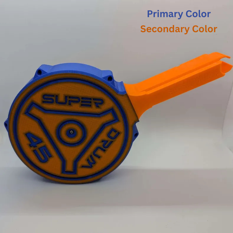 The Super Drum 45, designed by KptnAutismus, is a 3D printed 45 round drum style short dart magazine compatible with most talon compatible mag wells.
